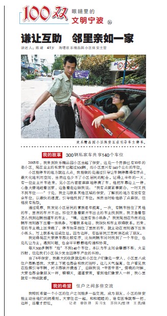 8ÔÂ11ÈÕ£¬¡¶Äþ²¨Íí±¨¡·A12°æ¡°100Ë«ÑÛ¾¦ÀïµÄÎÄÃ÷Äþ²¨¡±ÏµÁб¨µÀ£¬¹Ø×¢Á˹«Ë¾»¶Ï²¾«Æ·Ô°Ð¡ÇøÎÄÃ÷Í£³µµÄÐÂÎÅ¡£±¨µÀÓɸÃÐ¡Çø±£°²Ö÷¹ÜµÄ½²Êö£¬³äÂúÎÂÇé¡£ÏÖÔÚÈ«ÎÄ¿¯µÇÈçÏ£º